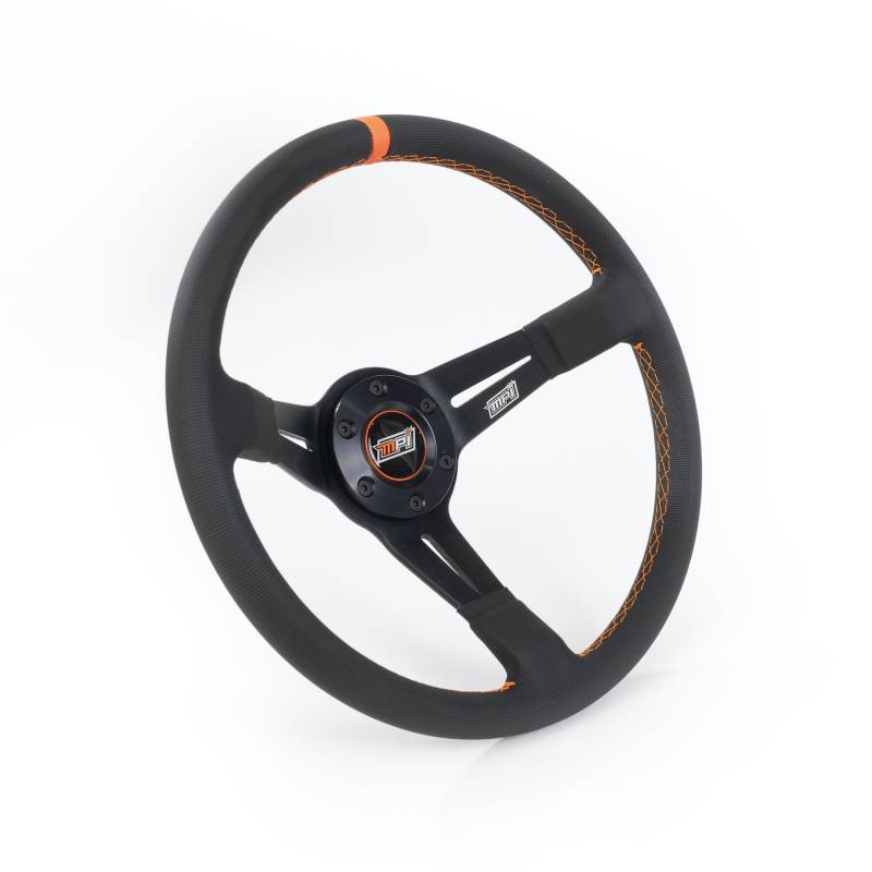 Two different covering materials are offered both featuring the MPI Orange™ marker: Suede and Pixel. The selected suede covering gives a very high grip feel, reducing the effort needed to hold the wheel while increasing driver feeling and giving a sporty look. This is the preferred material for drifting and tuner usage. The Pixel (PX) covering is an extreme weather, washable material and its MPI Orange™ crossed stitching is a preferred material for outdoor and off-road usage.