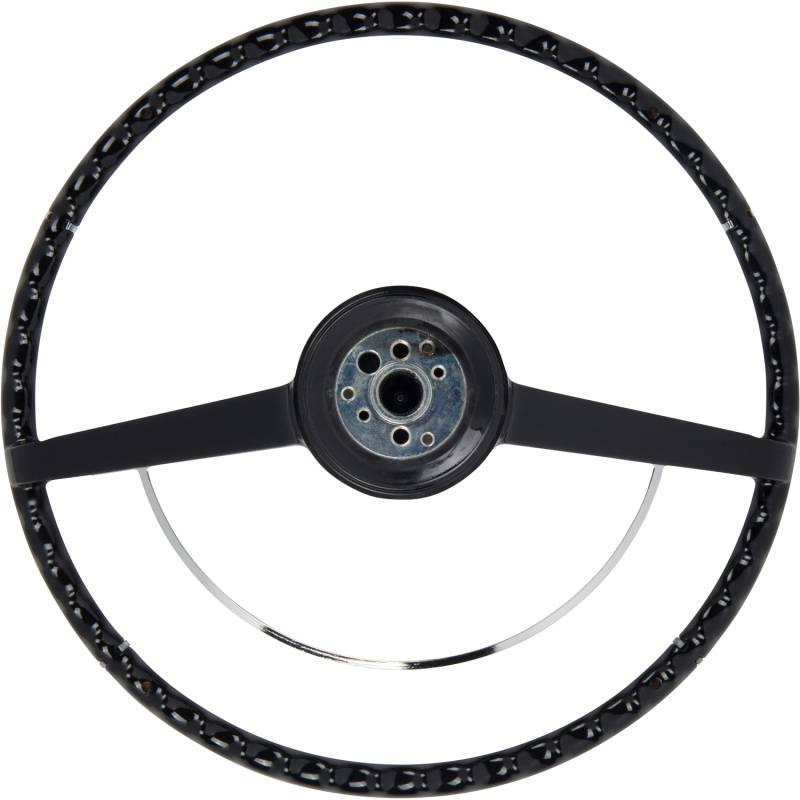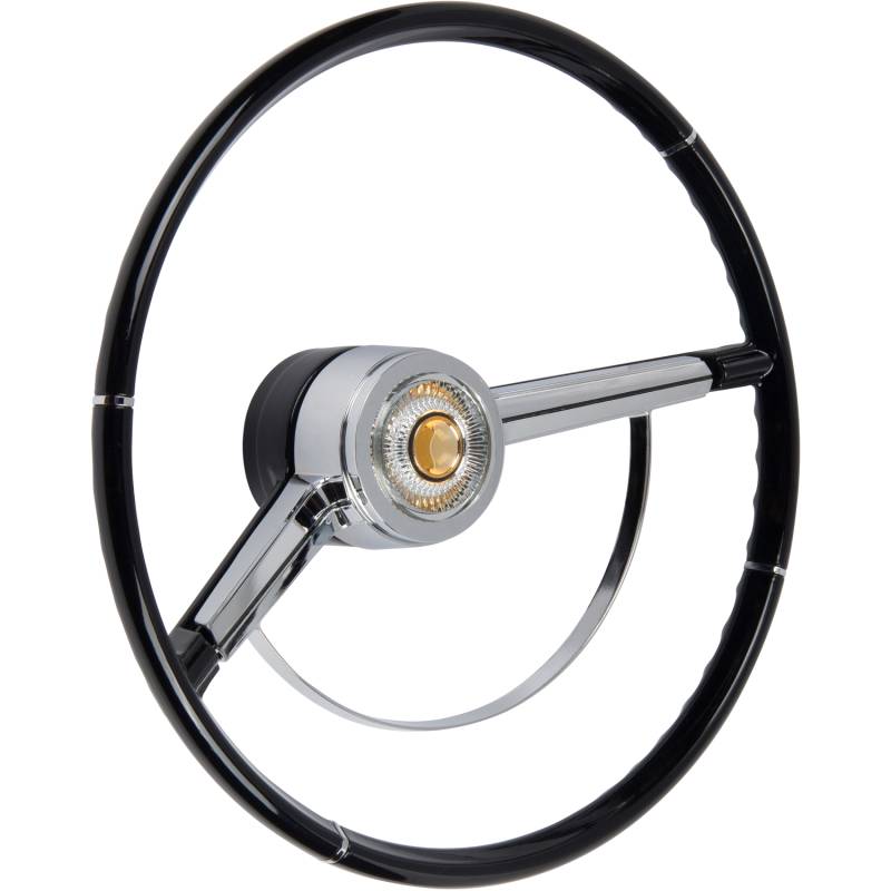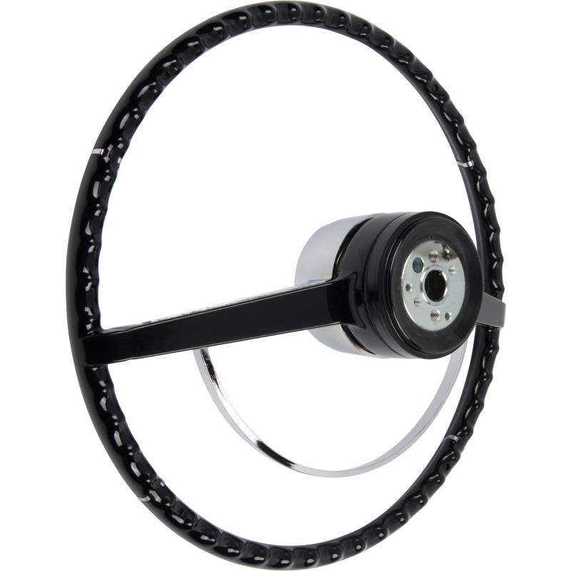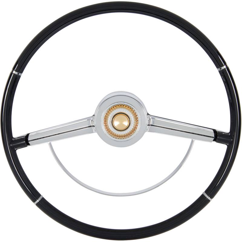 Made to fit to the original steering column using all the original horn hardware and turn signal switch parts. The American-Retro wheel comes complete with a chrome horn ring and a center cap. Installation is easy - just bolt it on! Finished in black. For other colors, simply paint to match your vehicle.