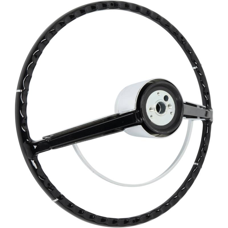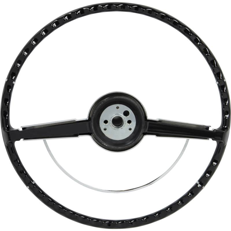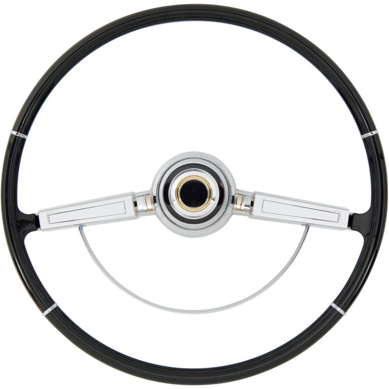 Made to fit to the original steering column using all the original horn hardware and turn signal switch parts. The American-Retro wheel comes complete with a chrome horn ring and a center cap. Installation is easy - just bolt it on! Finished in black. For other colors, simply paint to match your vehicle.