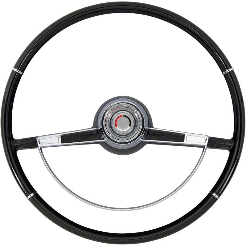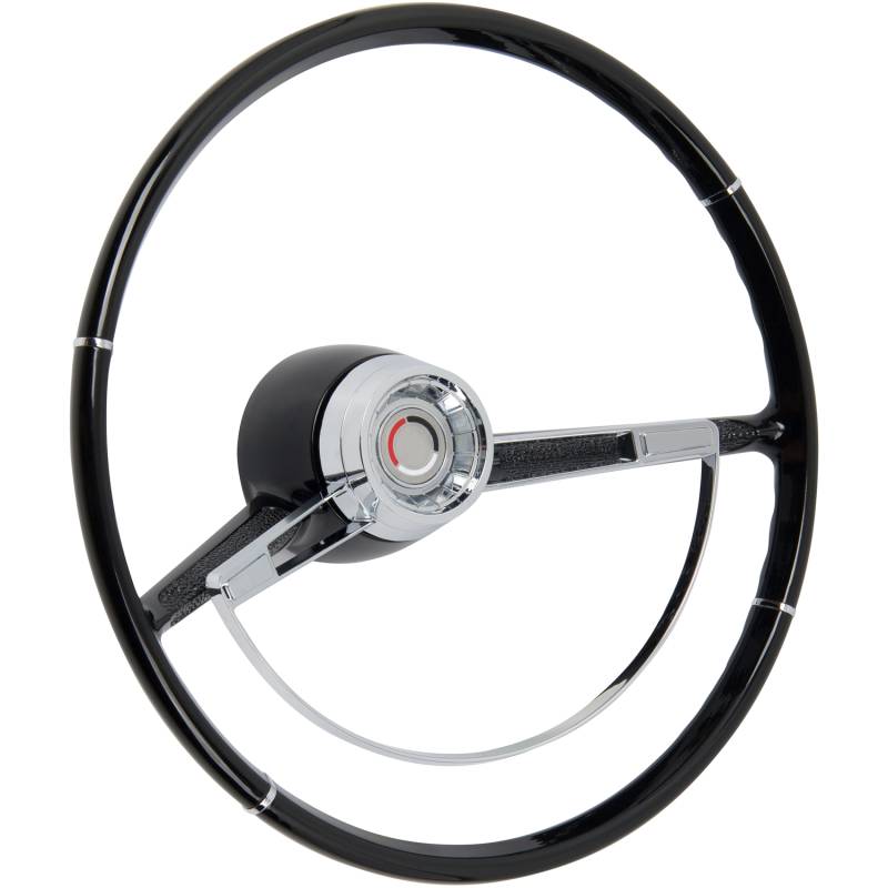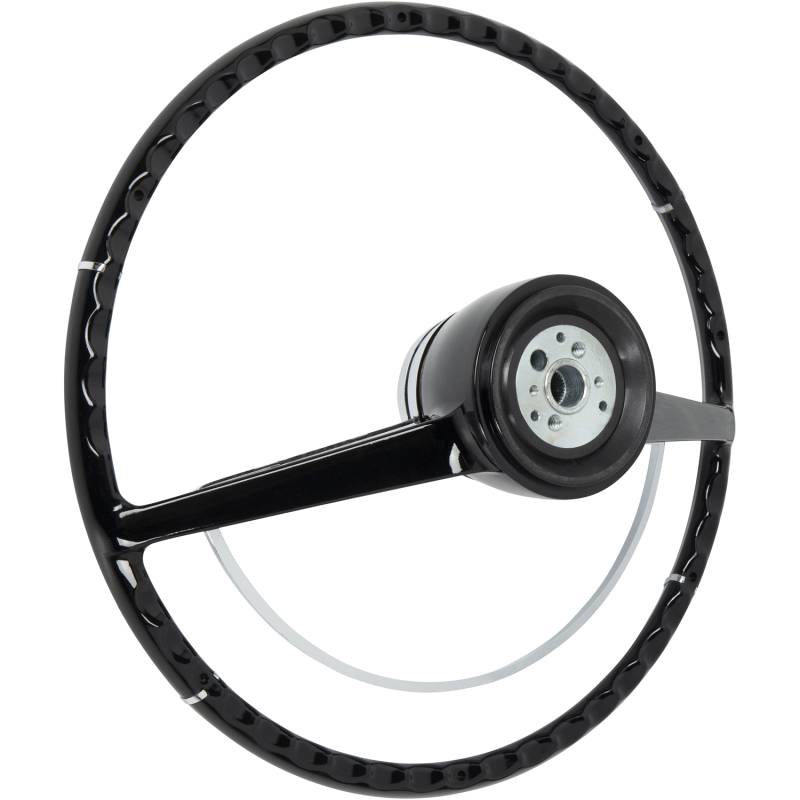 Made to fit to the original steering column using all the original horn hardware and turn signal switch parts. The American-Retro wheel comes complete with a chrome horn ring and a center cap. Installation is easy - just bolt it on! Finished in black. For other colors, simply paint to match your vehicle.