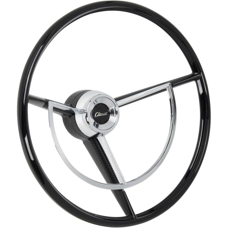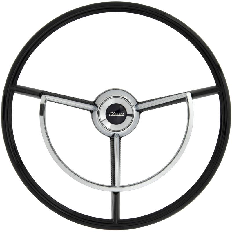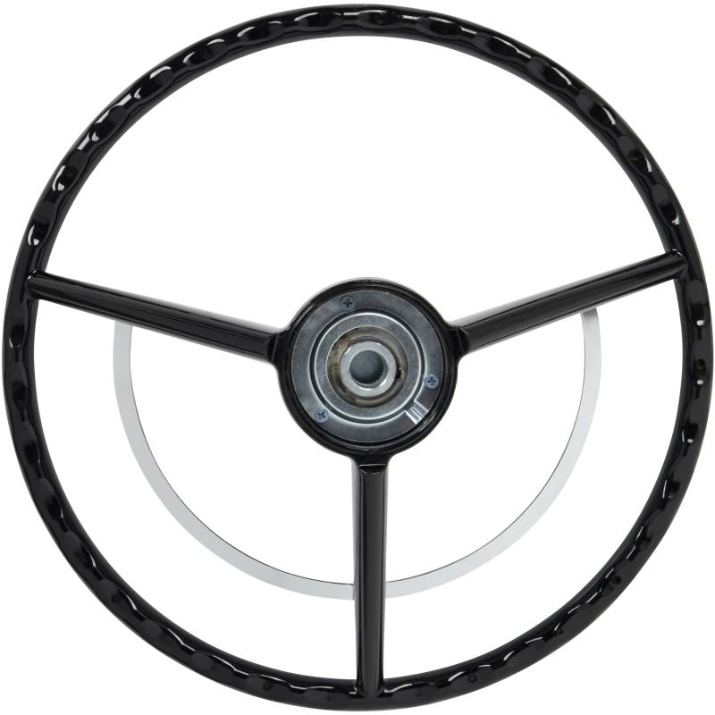 Made to fit to the original steering column using all the original horn hardware and turn signal switch parts. The American-Retro wheel comes complete with a chrome horn ring and a center cap. Installation is easy - just bolt it on! Finished in black. For other colors, simply paint to match your vehicle.