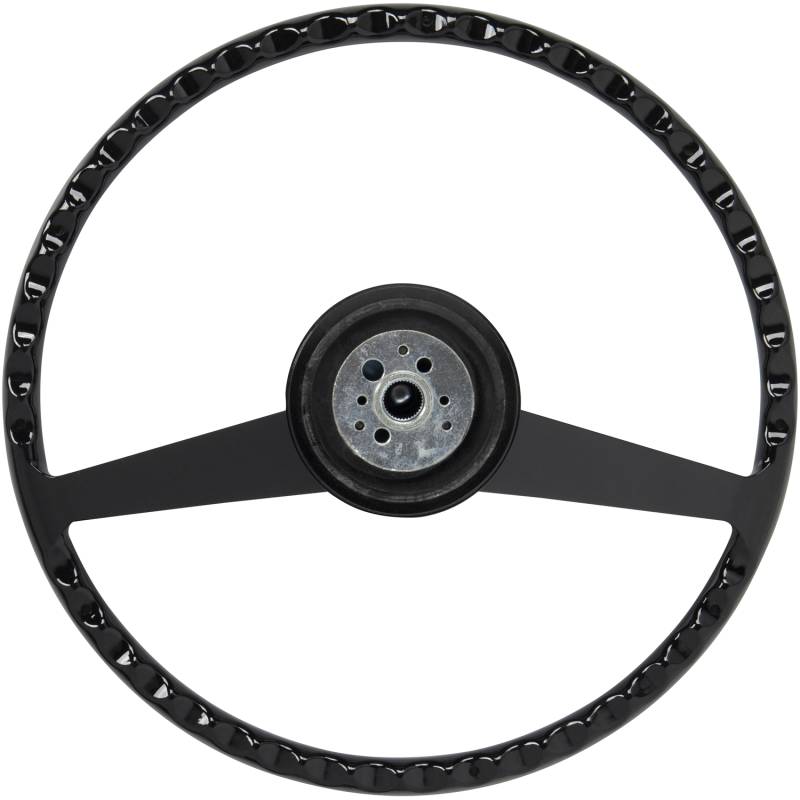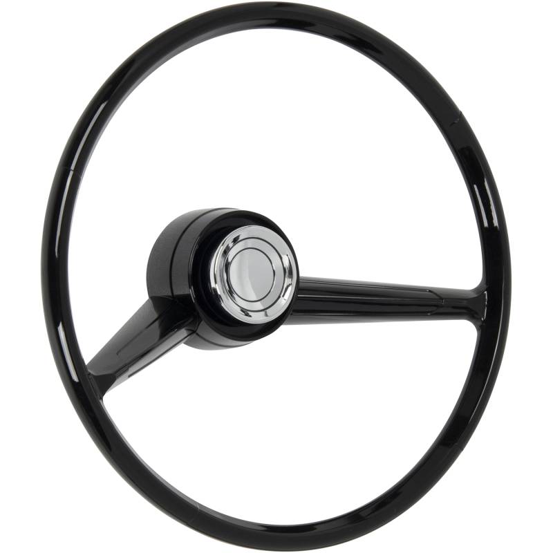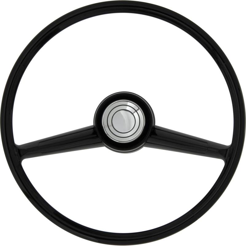 Made to fit to the original steering column using all the original horn hardware and turn signal switch parts. The American-Retro wheel comes complete with a chrome horn ring and a center cap. Installation is easy - just bolt it on! Finished in black. For other colors, simply paint to match your vehicle.