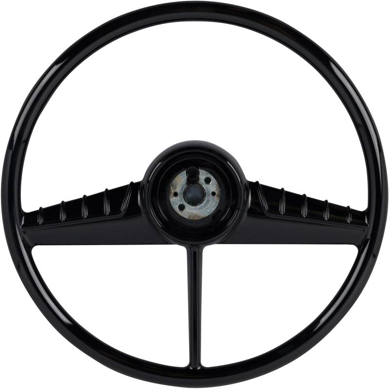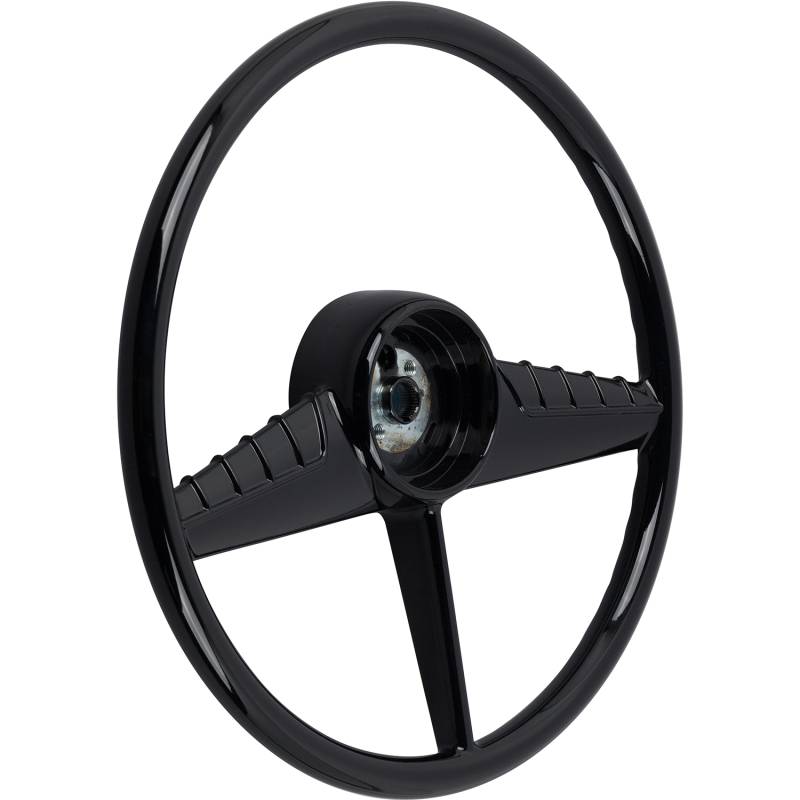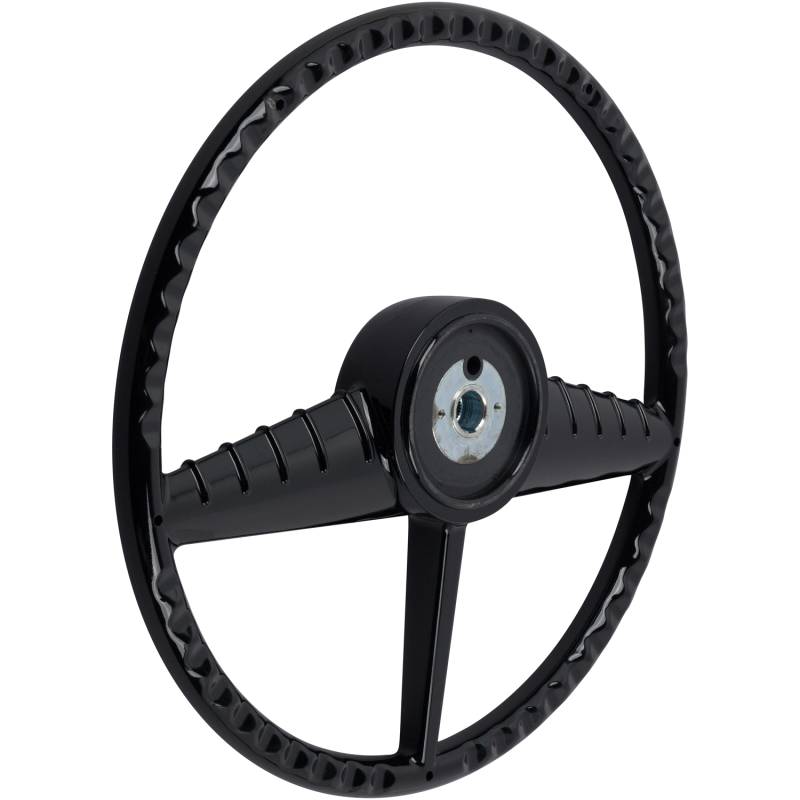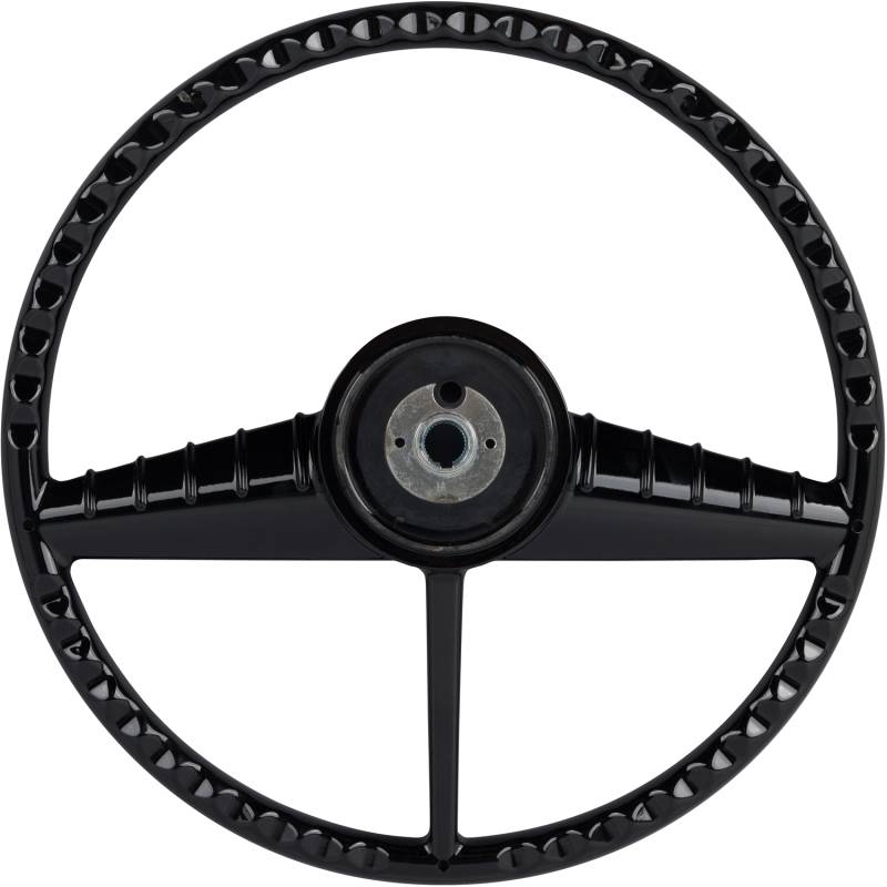Made to fit to the original steering column using all the original horn hardware and turn signal switch parts. The American-Retro wheel comes complete with a chrome horn ring and a center cap. Installation is easy - just bolt it on! Finished in black. For other colors, simply paint to match your vehicle.