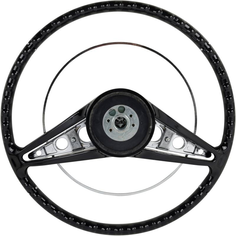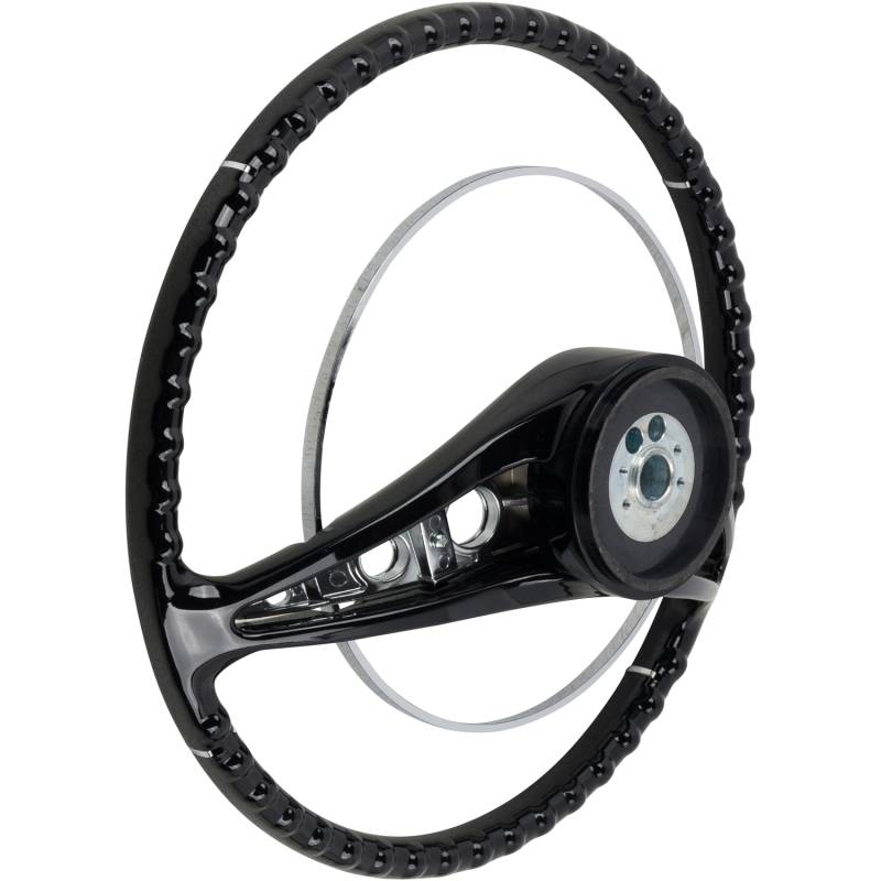 Made to fit to the original steering column using all the original horn hardware and turn signal switch parts. The American-Retro wheel comes complete with a chrome horn ring and a center cap. Installation is easy - just bolt it on! Finished in black. For other colors, simply paint to match your vehicle.